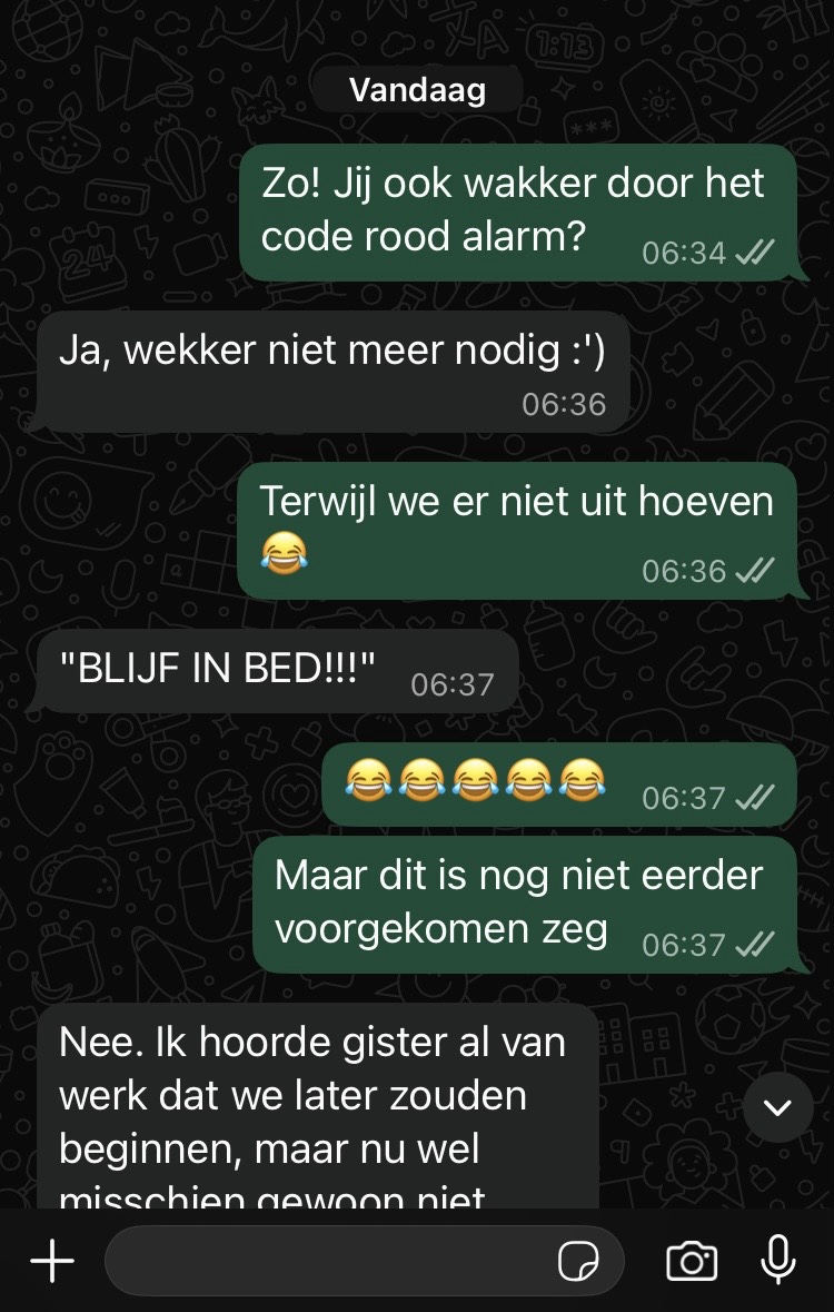 Zoon woont en werkt in Drenthe, hij is postbezorger en heeft nu ook een onverwachte dag vrij. Hij was ook wakker geschrokken door het alarm. Dus in alle vroegte waren we al aan het appen.