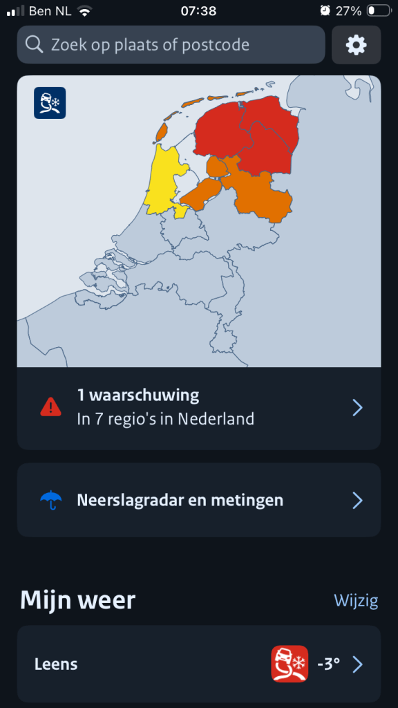 Vanmorgen 06.30. ALARM!!!! We waren nog in slaap en schoten verschrikt en verward overeind terwijl vanaf twee kanten de sirene van een NL-Alert afging. Verdwaasd grabbelden we allebei naar de plek waar onze telefoons lagen, ik gooide ‘m nog op de grond en we moesten ook onze bril nog zoeken om te kijken waar het om ging. Code rood voor het weer: