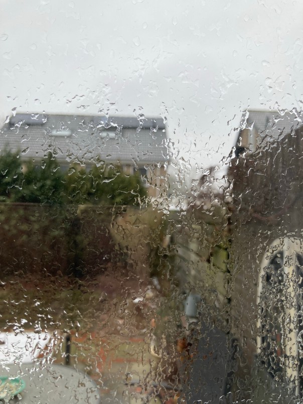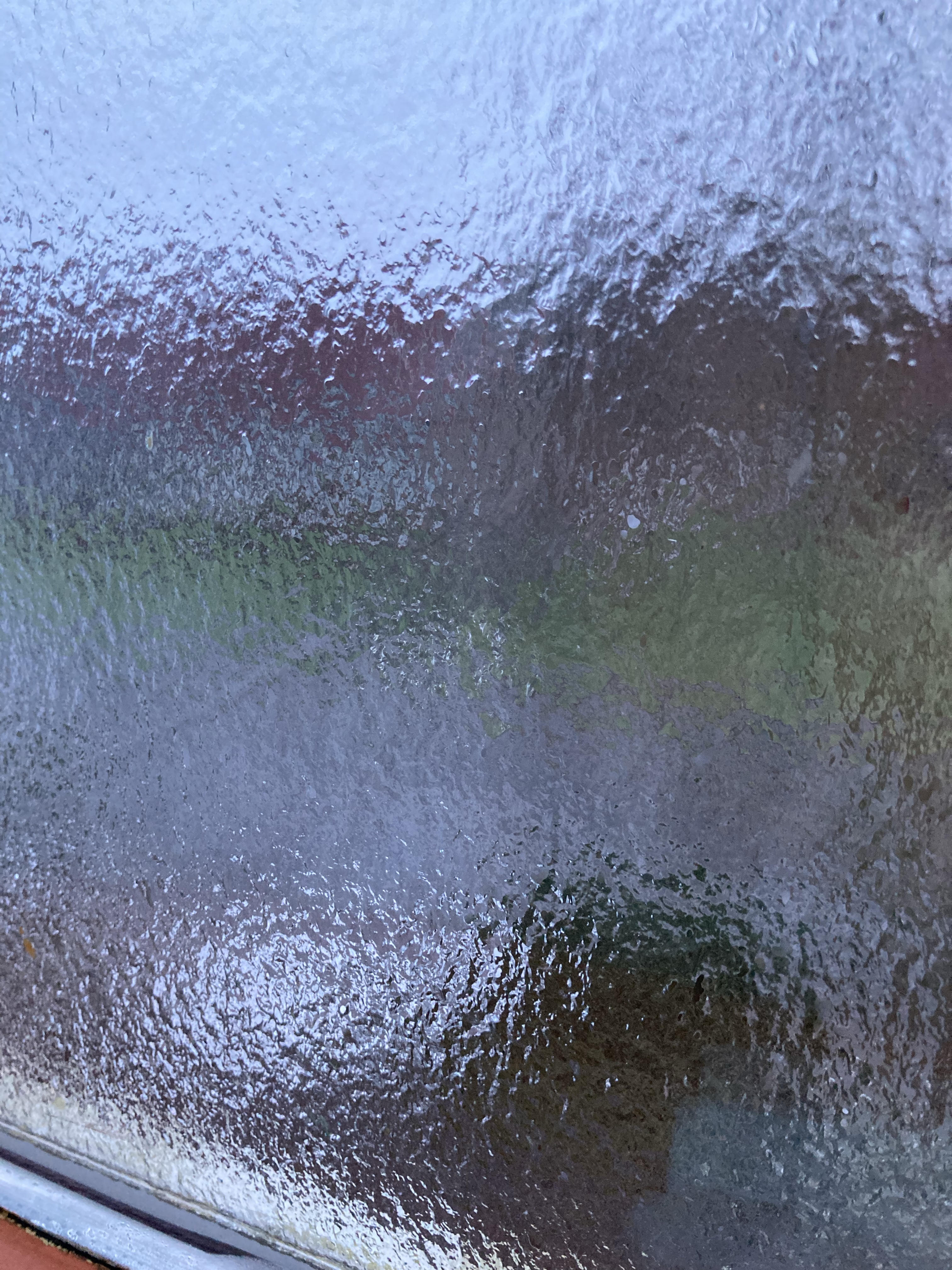 Inmiddels zijn wij warm aangekleed beneden en hebben de dag voor ons liggen. De hond mocht even in de tuin maar die gleed al bij zo’n beetje iedere stap uit, dus wij gaan niet aan de wandel. Het raam boven zag er zo uit: