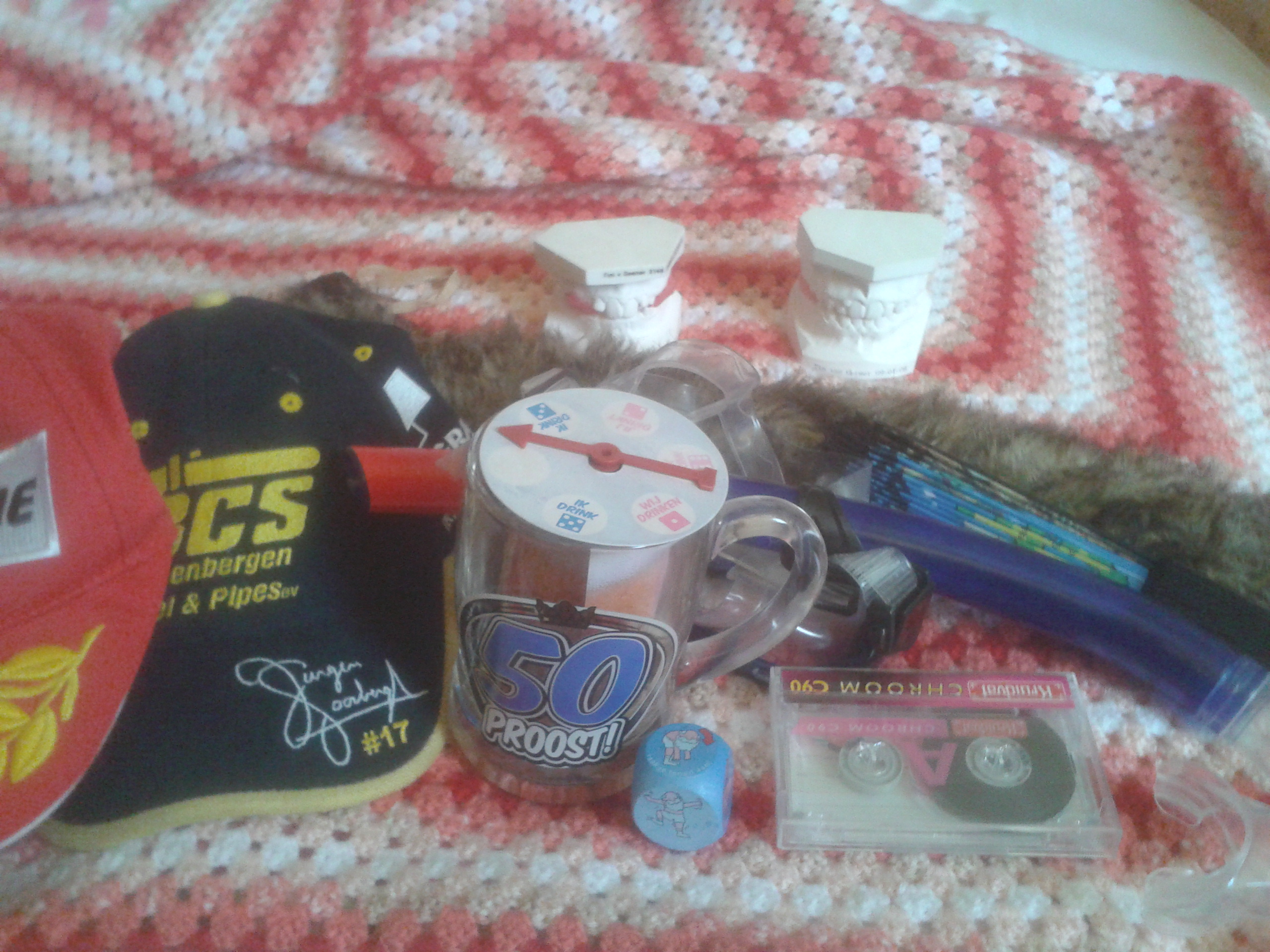 Een voor- en een na-de-beugel gipsafgietsel van Tims gebit. Een paar petten. Een nepbontkraagje. Een reisportemonneetje wat we volgens mij nooit gebruiken. Een bierglas-met-spelletje. Een cassettebandje met onze trouwdienst erop.