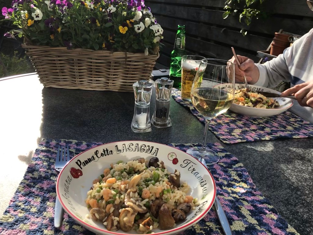 Jullie hebben ongetwijfeld ook lekker gegeten en daar waar jij woont/bent is het vast ook mooi weer. Maar ik moet gewoon even in de rondte roepen hoe heerlijk het hier was. We aten risotto met paddenstoelen en garnalen. Buiten. In de avondzon. Met een glas wijn erbij (ik tenminste, Bert koos een biertje)