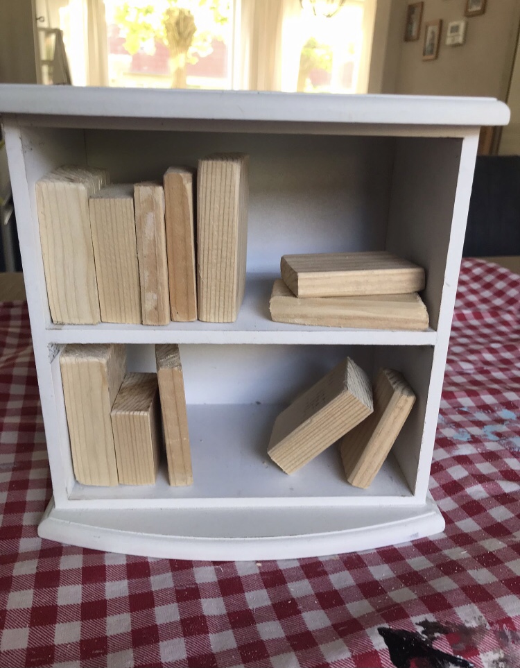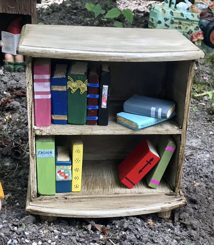 Laadjes eruit, verschillende maten houten blokjes gezaagd en geschuurd, druk geweest met verf en andere knutselspullen, et voilà! De mini-minibieb was een feit.