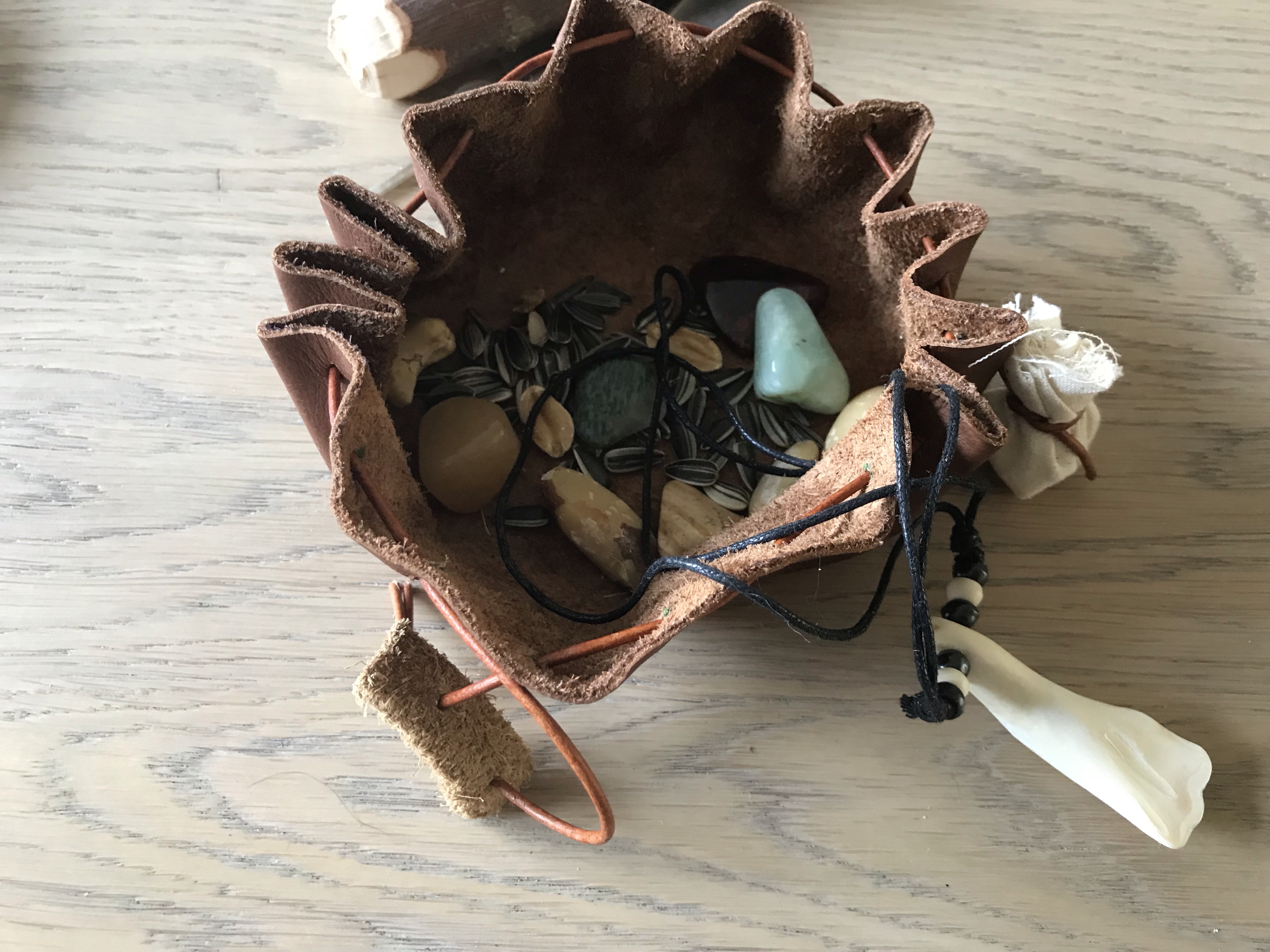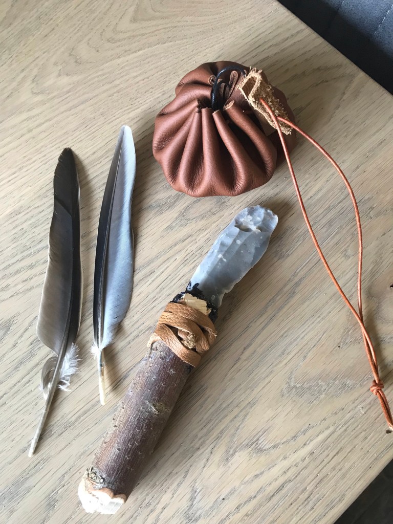 En het was zó gaaf wat er in zat! Een vuurstenen mes (een echte!) en een leren amulet-buideltje met inhoud en toebehoren.
