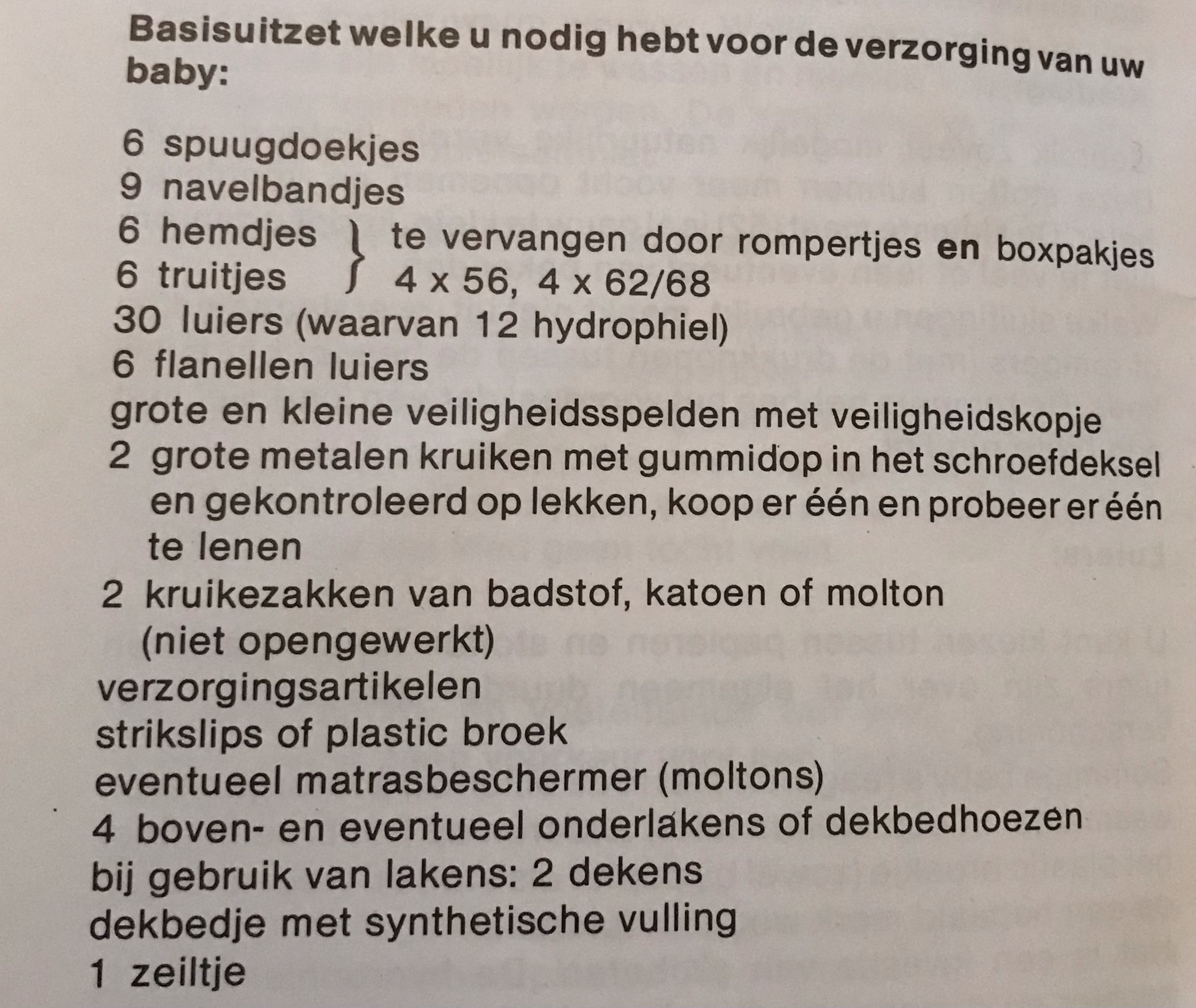 We moesten overslaghemdjes en navelbandjes kopen, truitjes met koordsluiting ( best eng achteraf!), en alles wit want je wist niet of je een jongen of meisje kreeg. Het wiegje had een dekbedje, je kindje moest op de zij liggen en je moest dan bijhouden dat het ‘t ene dutje op de linkerzij lag en het andere dutje op de rechterzij. Je kindje mocht tijdens de voeding bij je, de rest van de tijd op het eigen kamertje. Geen co-sleeper of wiegje op je slaapkamer, moeder had rust nodig en de baby werd ergens anders neergelegd. Ik vond dat toen al vreselijk, ik zou juist veel meer rust gehad hebben als het bedje van mijn baby vlak naast me stond, of dat ik mijn kindje veel vaker bij me op de arm mocht hebben. Ik moest verplicht in bed blijven de eerste dagen, ook al voelde ik me prima. Alles natuurlijk met de beste bedoelingen, maar ik denk ook wel veel uit traditie. Het Rust Reinheid Regelmaat principe werd erg ver doorgetrokken, waarbij de natuurlijke behoeften van moeder en kind nog wel eens een beetje op de achtergrond raakten. Natuurlijk hebben we het op een zo goed mogelijke manier gedaan in die tijd. Maar als ik zie hoe sommige dingen nu gaan, denk ik toch dat het beter, natuurlijker is.