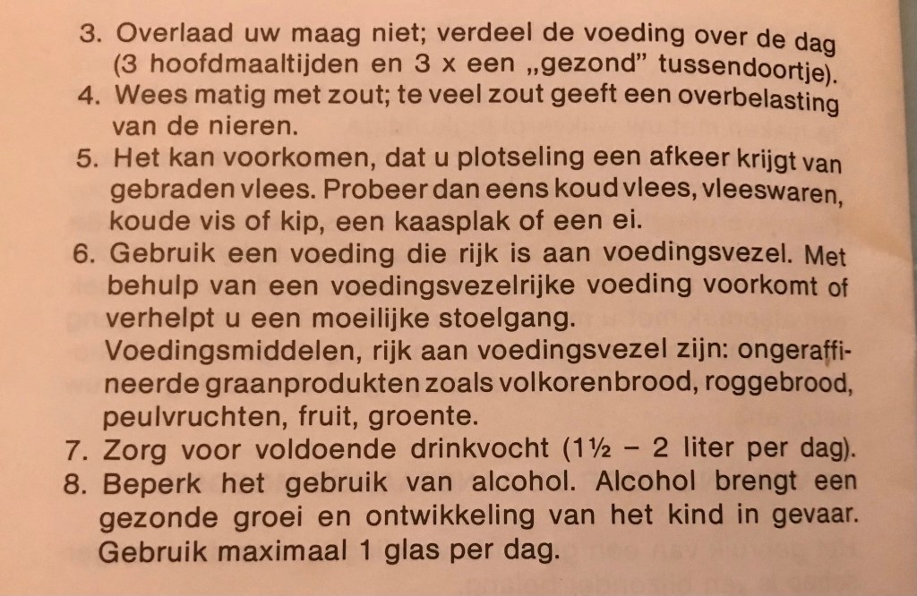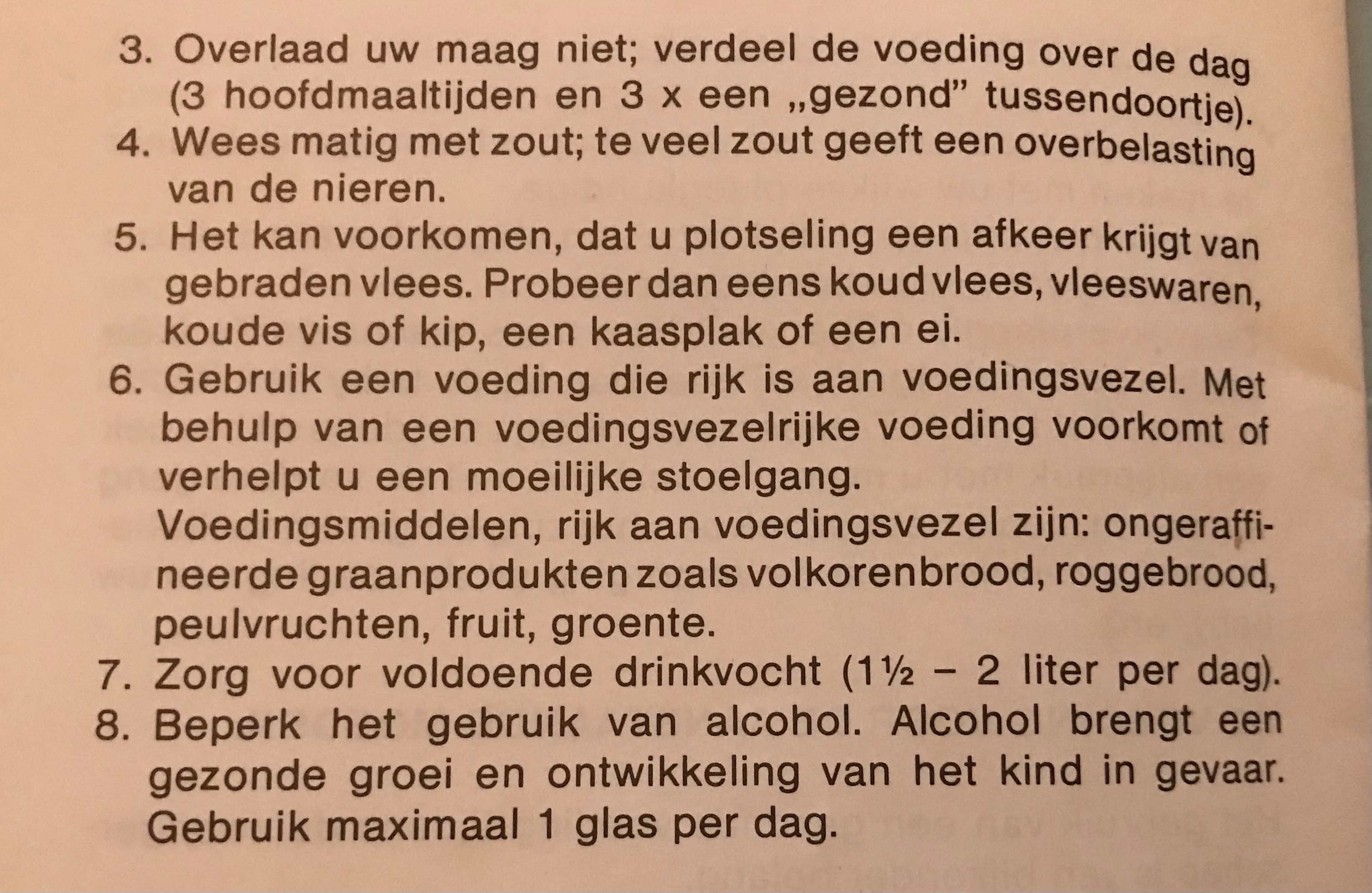 Toen mijn dochter zwanger was, moest ze bepaalde soorten eten en drinken laten staan. Zelfs nu met de tweede was het alweer anders als met de eerste. Alles voor de veiligheid. Wat op zich natuurlijk wel heel erg verstandig is. Toen ik zwanger was? Kijk dan bij punt 8: