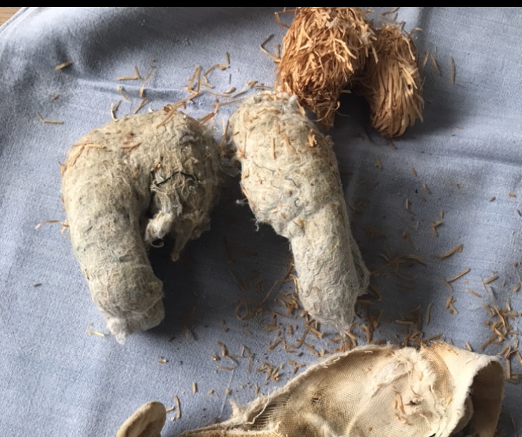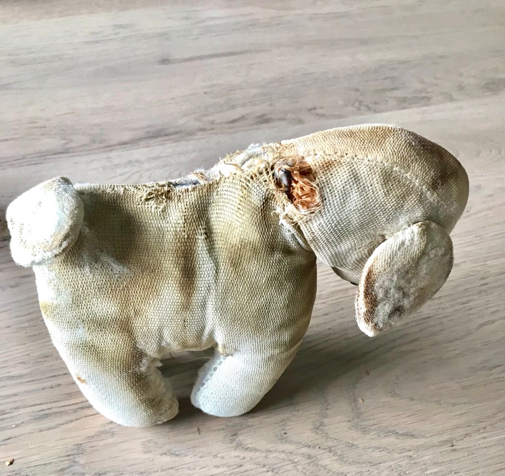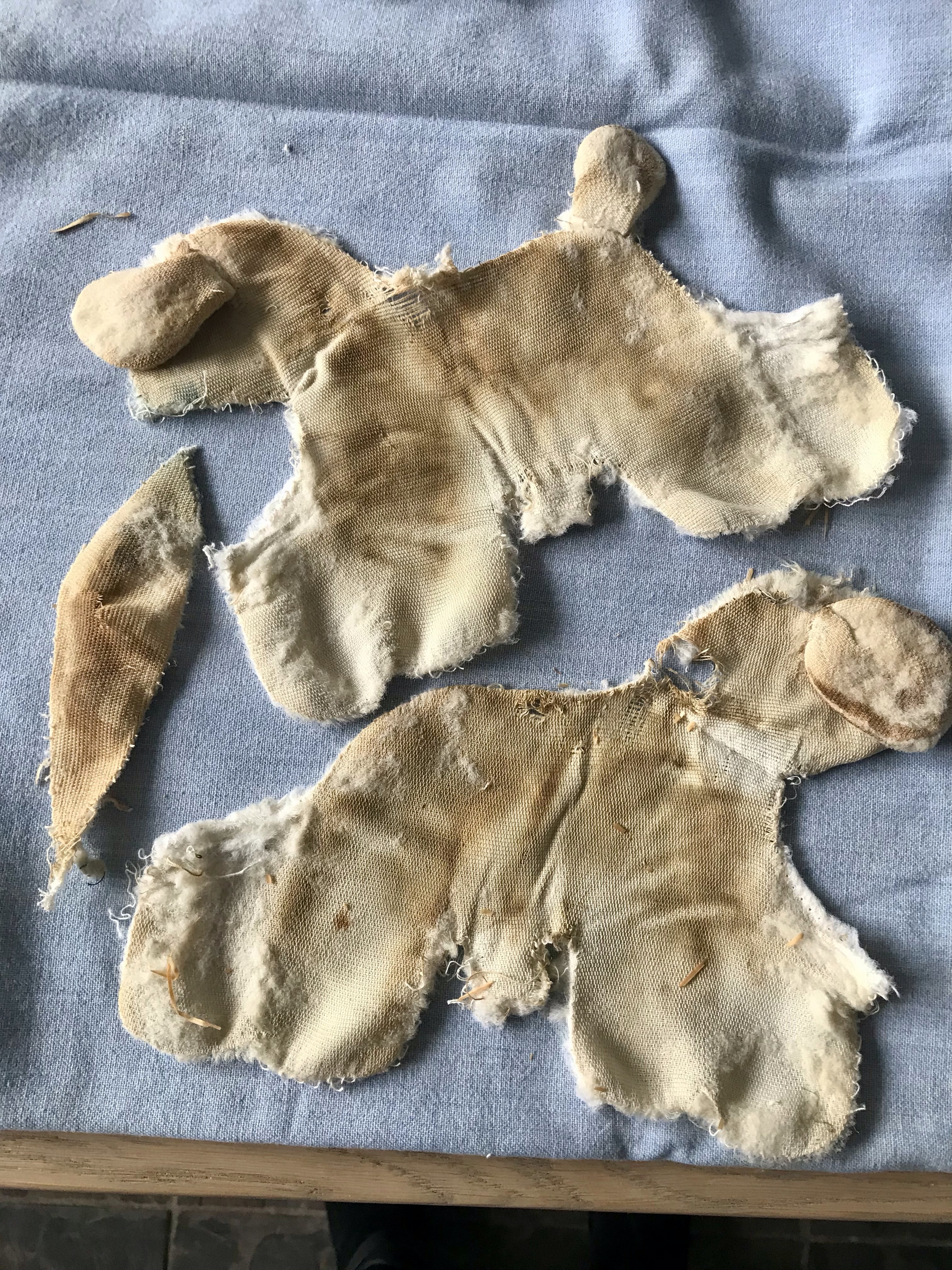 Eerst moest hij uit elkaar. Het kopje bleek gevuld met stro, het lijfje en de pootjes met kapok. Ik heb dit niet bewaard, dit was te oud en te slecht.