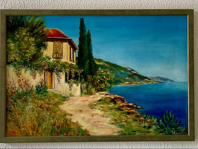 En toch wist ik alles van dit schilderij, want ik keek er heel vaak naar. De kleuren van het huis, de hangende bloemen langs de gevel. Het pad wat naar de deur loopt, net een stukje bij het water vandaan.