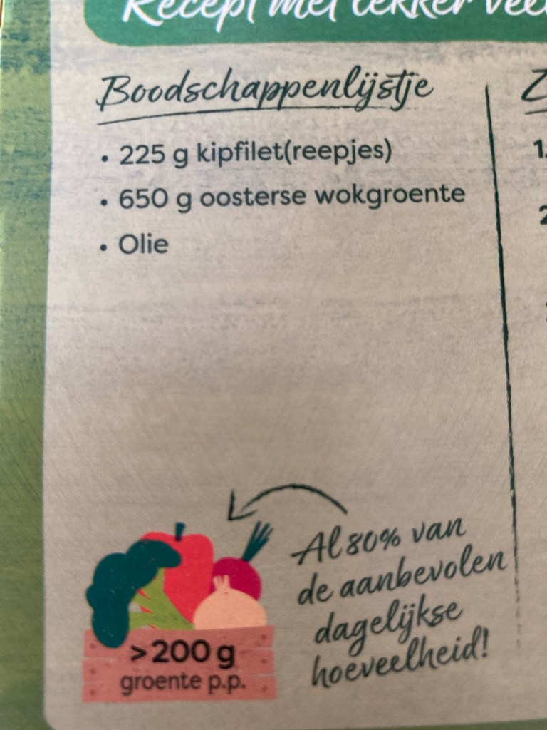 Ik herhaal: ZELF , ik herhaal nòg een keer: ZÈLF 650 gram groente kopen en toevoegen.