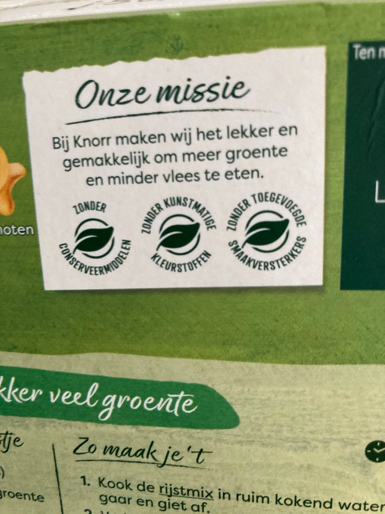 Ergens is op een dag bij Knorr een marketingpief geweest die zei: ‘Instantpoeder en bewerkte producten raken uit de gratie. We moeten inspelen op de gezondheidstrend. Niet dat we in de praktijk iets veranderen, maar we doen net alsof we dat wel doen. Laten we wat gezonde kreten en betrokken quotes op het pak gooien, zoals ‘lekker veel groente’ en ‘onze missie’ en dat we dingen beloven enzo.’ En iedereen stemde in met deze gedachtenkronkel, dus zo geschiedde.