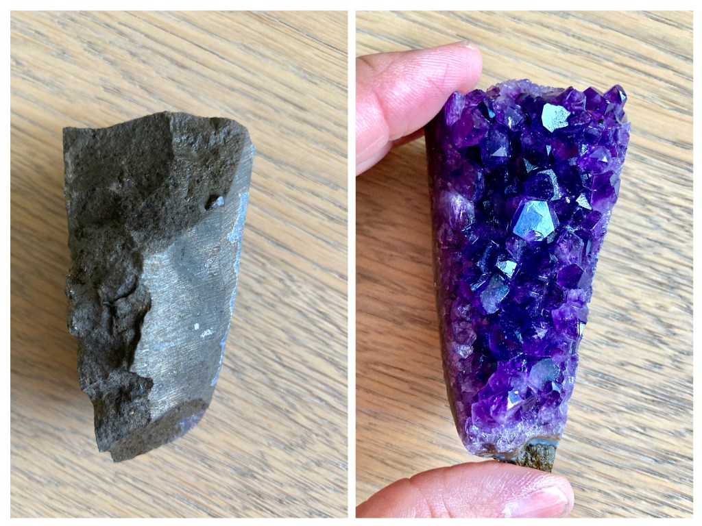 Ik ben vooral enorm onder de indruk van stenen met een binnenste. Van buitenaf gezien gewoon een grijze of beigebruine steen, maar van binnen blijken er de prachtigste vormen en kleuren te zitten. Denk maar aan amethist bijvoorbeeld: Aan de buitenkant lijkt het gewoon een stuk grijze rots, maar van binnen schitteren paarse kristallen. Prachtig!
