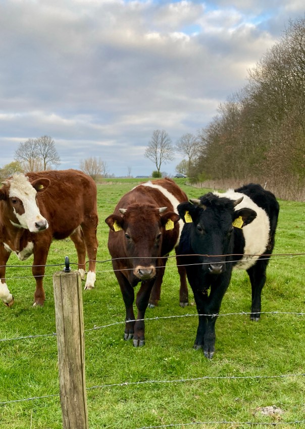 De vroege ochtend is lichtgrijs krijgt kleur als de zon hoger komt Muziek van Brian Eno in mijn oren, zacht, zodat het de vogels niet overstemd De cadans van mijn stappen en van die van mijn hond maken ons een vertrouwd team al bijna elf jaar samen In de weide, die gister nog leeg was staan achterin een paar jonge koeien ze heffen hun koppen als ze ons ontwaren en komen naar ons toe gedraafd ik blijf staan om tegen ze te praten hun adem maakt warme wolkjes stoom hun prachtige ogen blijven me aankijken het is alsof ze me verstaan De hond stopt zijn neus in een grote pol uitbundig bloeiende narcissen en de vogels blijven zingen Als we uiteindelijk verder gaan kijken de koeien ons na Ik ben rijker dan de rijkste miljardair