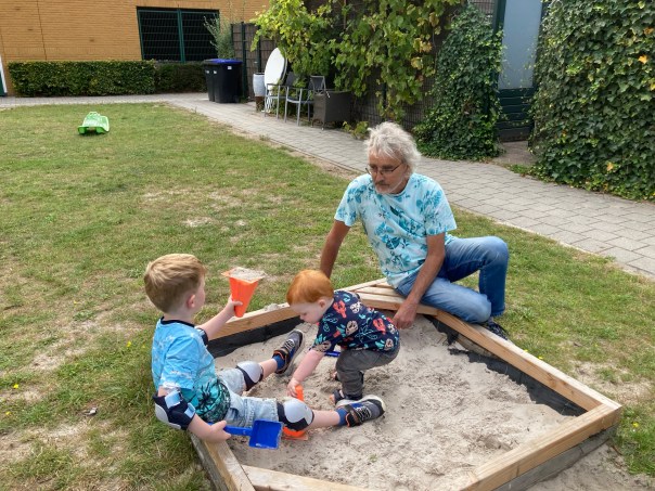 Voor het eten ging Bert nog met de kleinzoons taartjes bakken in de zandbak.